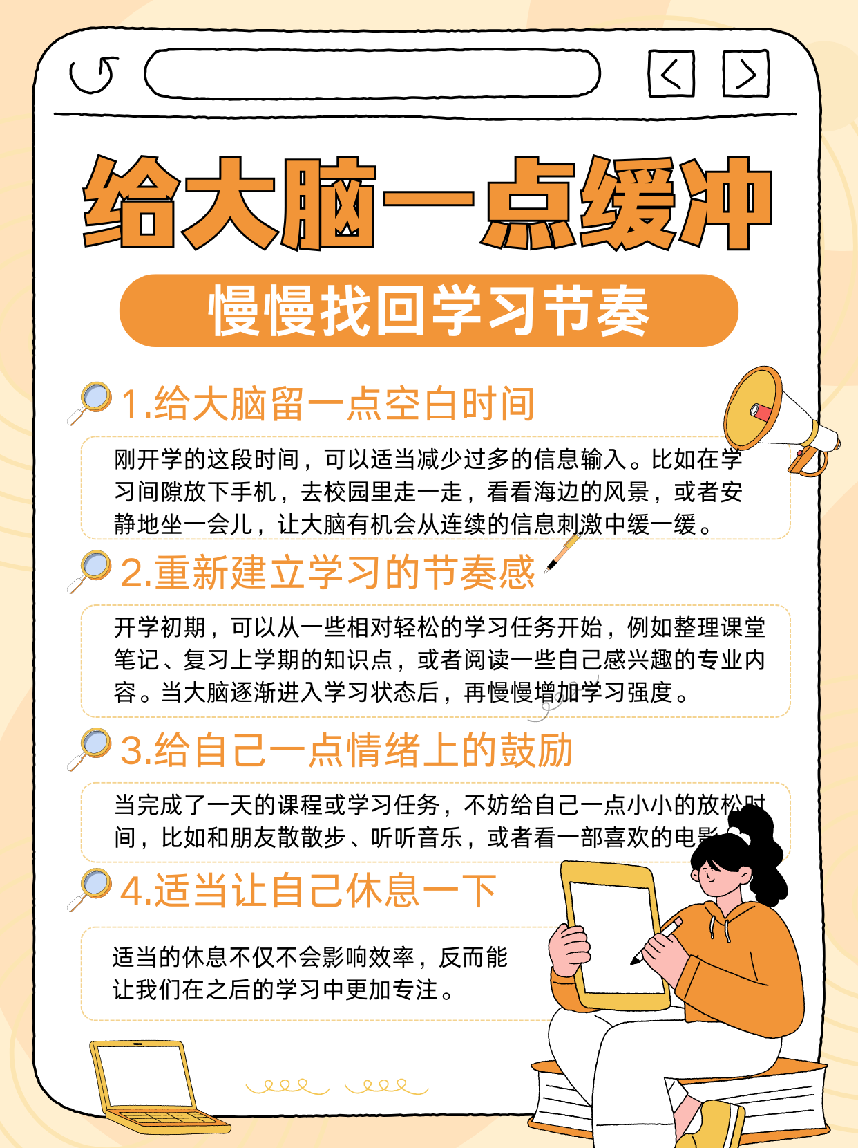 适当的休息不仅不会影响效率,反而能让我们在之后的学习中更加专注。